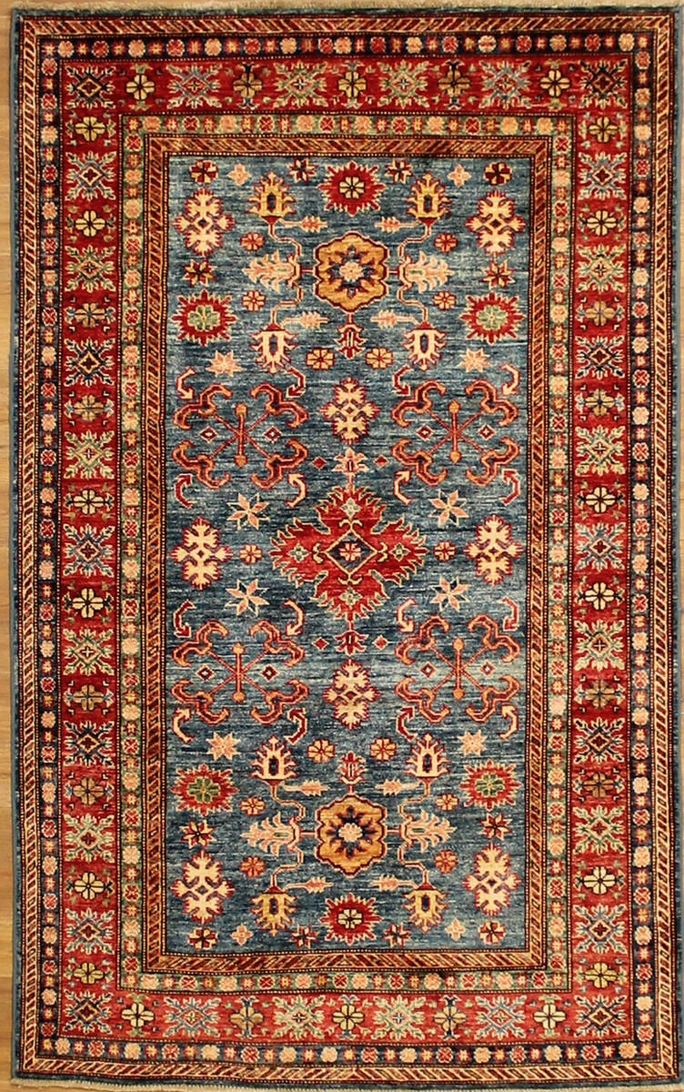 Hand knotted with wool pile and vegetable dyes with a cotton foundation.