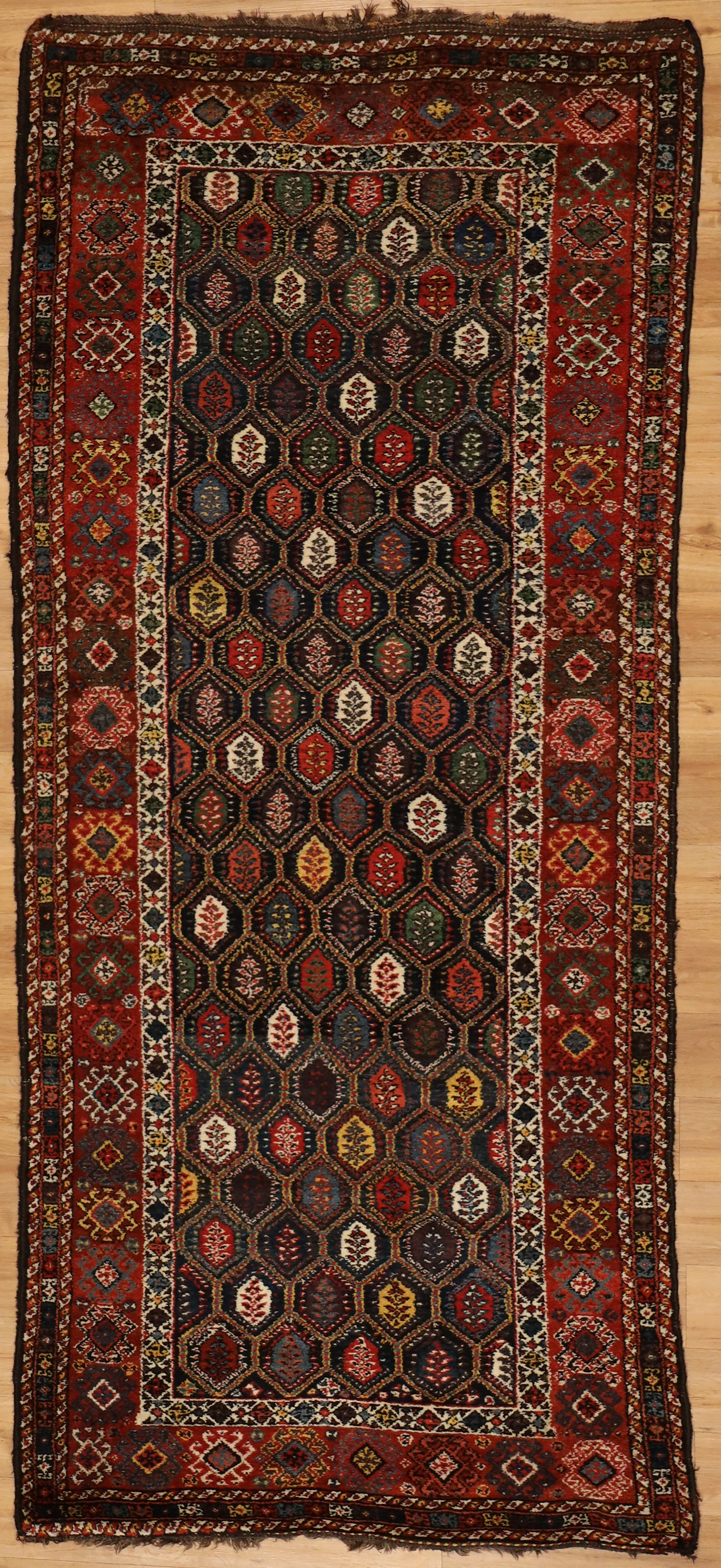 This hand-woven Antique Bakhtiari tribal rug is approximately 100 years old and in perfict condition with full piel. It has been woven with wool pile and wool foundation. The size of this rug is 4' x 9'10".