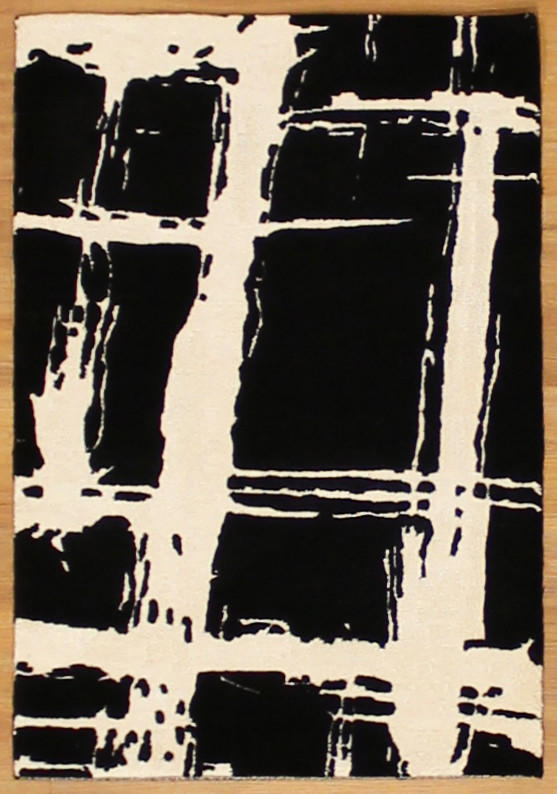 Hand knotted with wool pile and cotton foundation, measures 2' X 2'11 with a black and white modern design.