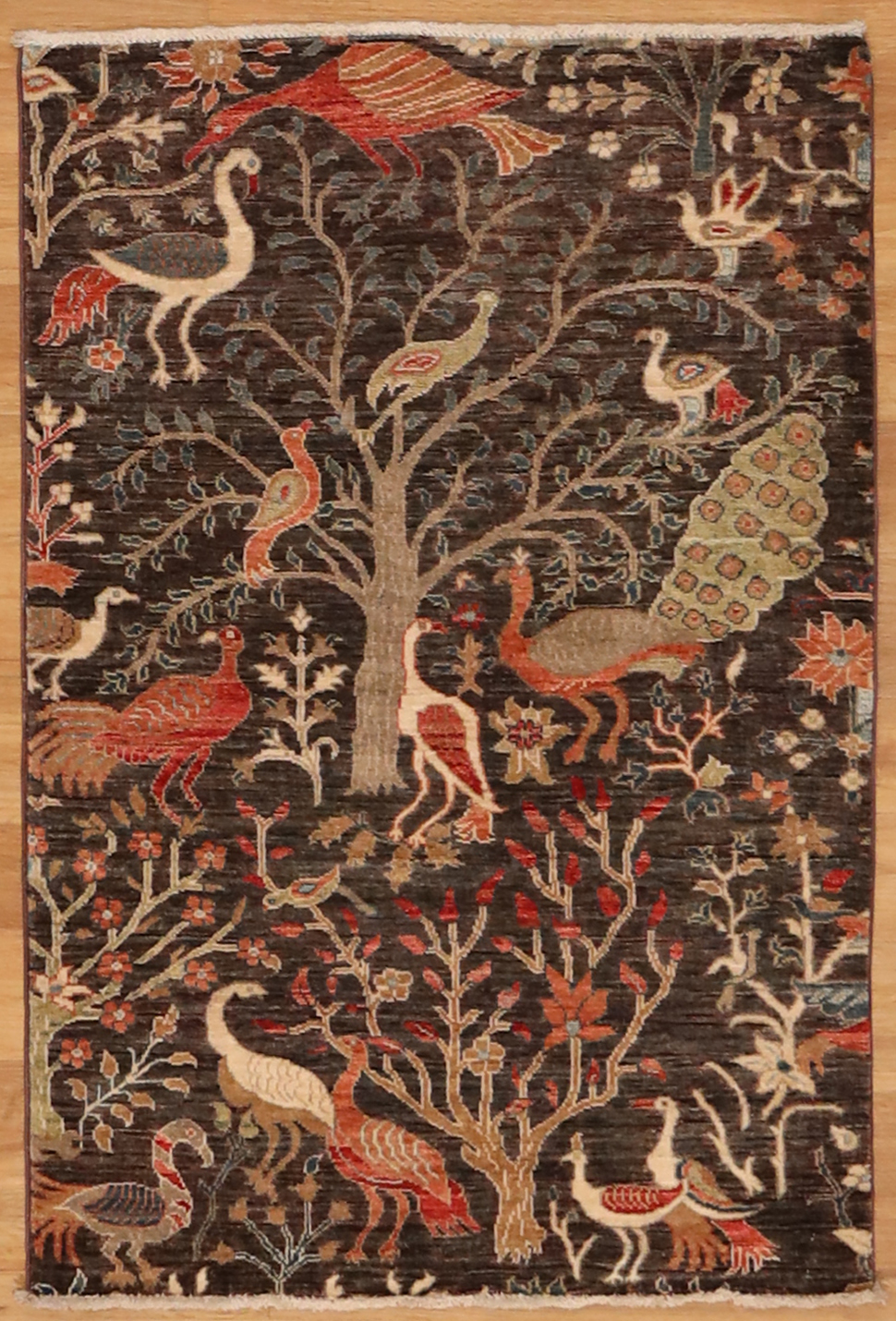 Black Background Bird design rug 3'3"x4'10", woven in Pakistan with hand-spun wool and cotton foundation.