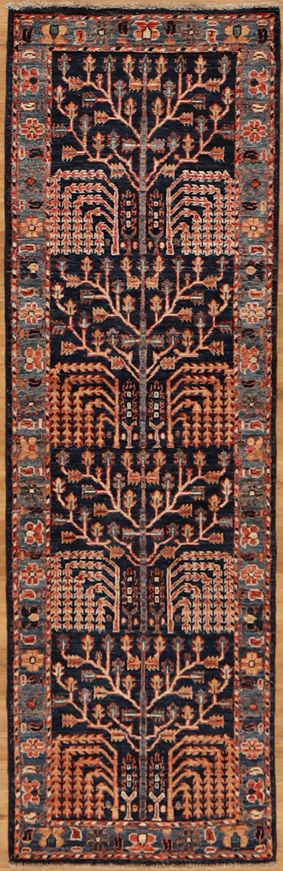 Blue background, narrow and short runner 1'11" x 6'1" woven with hand spun wool in Pakistan.