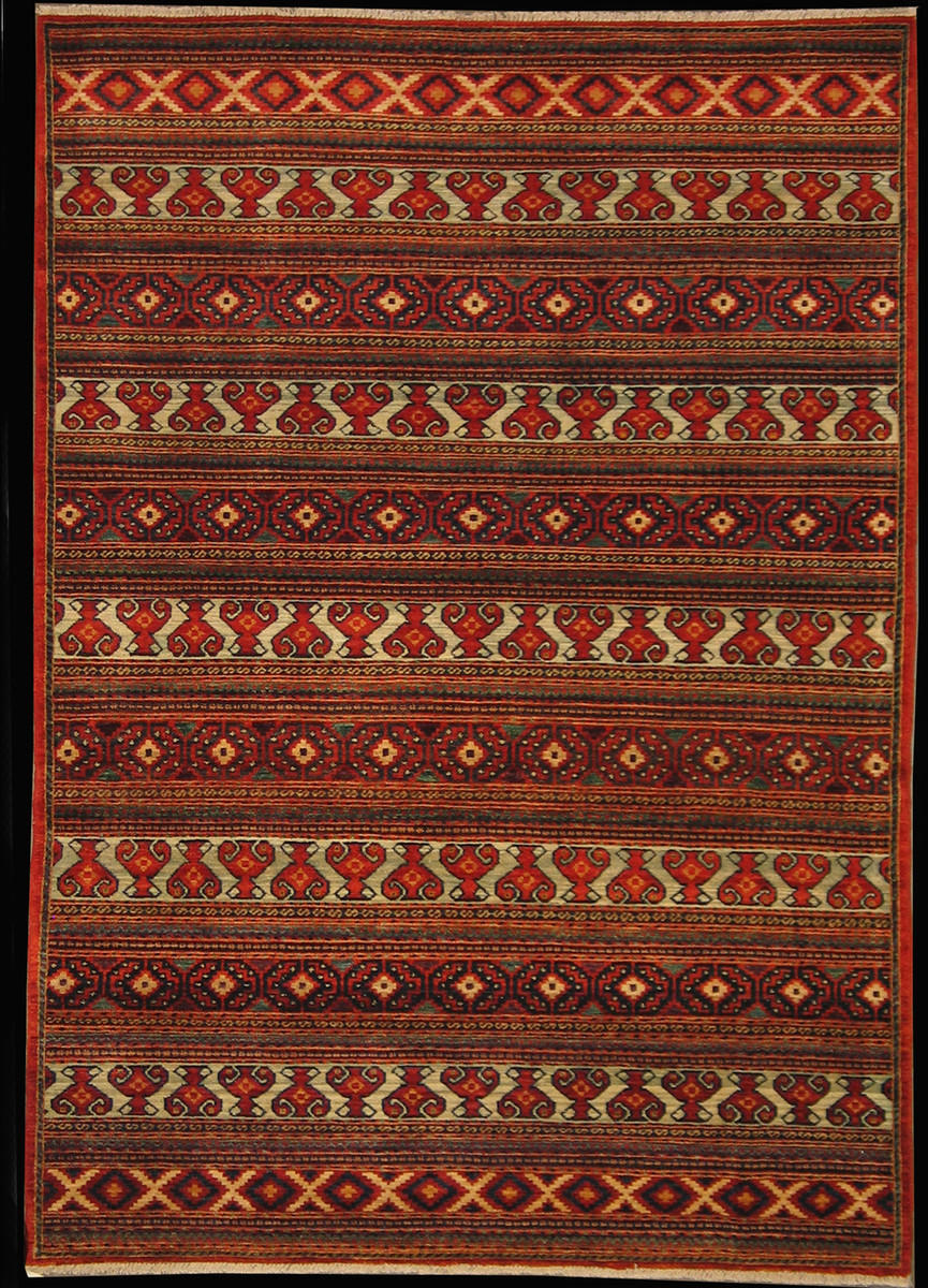 Modern design rug, handwoven with hand-spun wool and vegetable dyes; it measures 6'1 X 8'8. This light multi color background transitional design carpet has been woven with high-quality wool and could last for decades in your home. This carpet can pair nicely with furniture and other art pieces in your room. Visit us today or purchase it on our secure website with fast check out and take advantage of our free shipping.