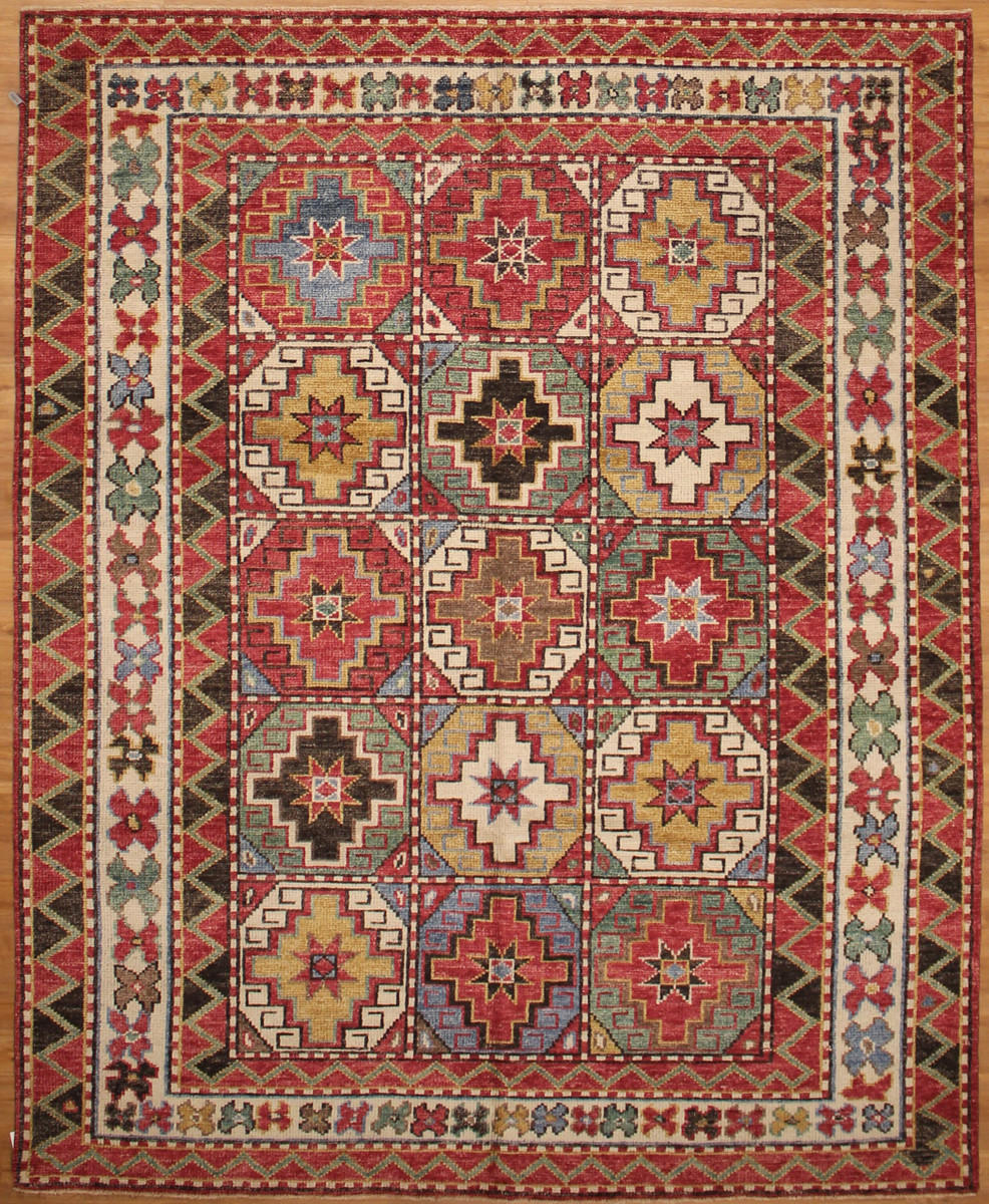 Hand Knotted in India with 100% wool pile. Multi color rug, light blue, black,brown, light olive green, purple red, gold, navy, salmond, beige colors.