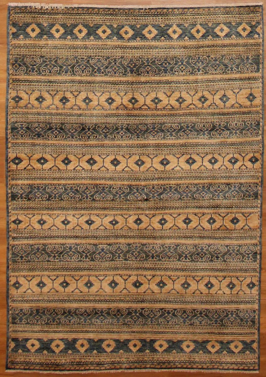 Available for sale Contemporary style carpets, handwoven with hand-spun wool and vegetable dyes; it measures 4'11 X 7'1. This beige and blue background modern design rug was woven with high quality wool and could last for decades. Visit us today and take it for a free home trial or purchase it on our secure website with fast checkout and take advantage of our free shipping.