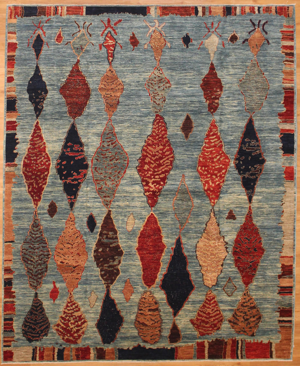 Gabbeh style modern design rug produced by an organized weaving project in Afghanistan using vegetable dyes and hand spun wool.