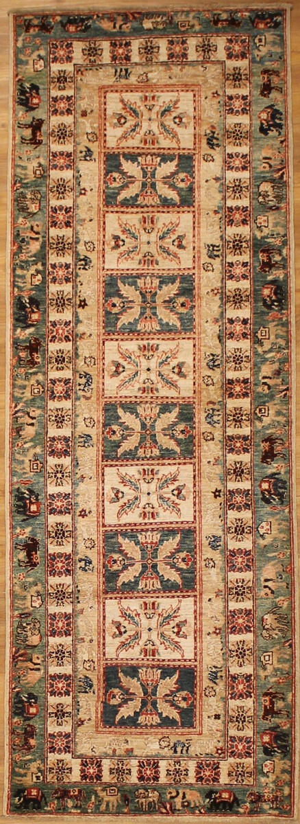 Liven up your hallway with this green and beige color runner with animal motifs in the border. This rug is hand knotted, woven in Pakistan with hand spun wool. High quality wool in this rug makes it suitable for hallway or heavy traffic areas in your house like kitchen or front entry.