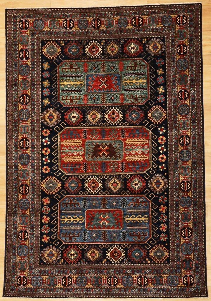 This new 6'1"x8'11" carpet is handwoven in Afghanistan using vegetable dyes and handspun wool. Its tribal caucasus design balances ecstatic bright colors on a dark navy blue field and is sure to bring joy to any home or space.