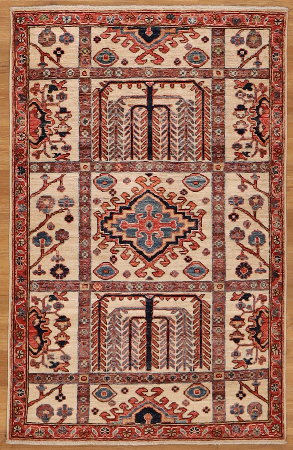 Light Backgound Hand-Knotted small rug 3'1"x5', woven in Pakistan with hand-spun wool and cotton foundation.