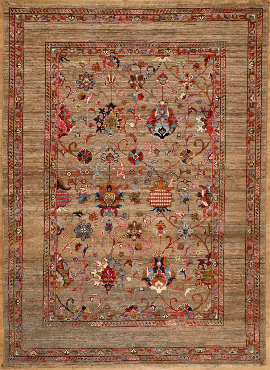 For sale is this brownish-gray background hand-knotted rug with an overall design. This room size (5'9 X 7'11) carpet has a brownish-gray border with red, beige, green, light blue, and navy-blue accent colors. It is woven with high-quality wool, which makes it last for a long time and is suitable for the high traffic area of your home. Visit us today and take it home for a home trial or purchase it on our website and take advantage of our free shipping, easy one-page secure checkout, and easy return policy.