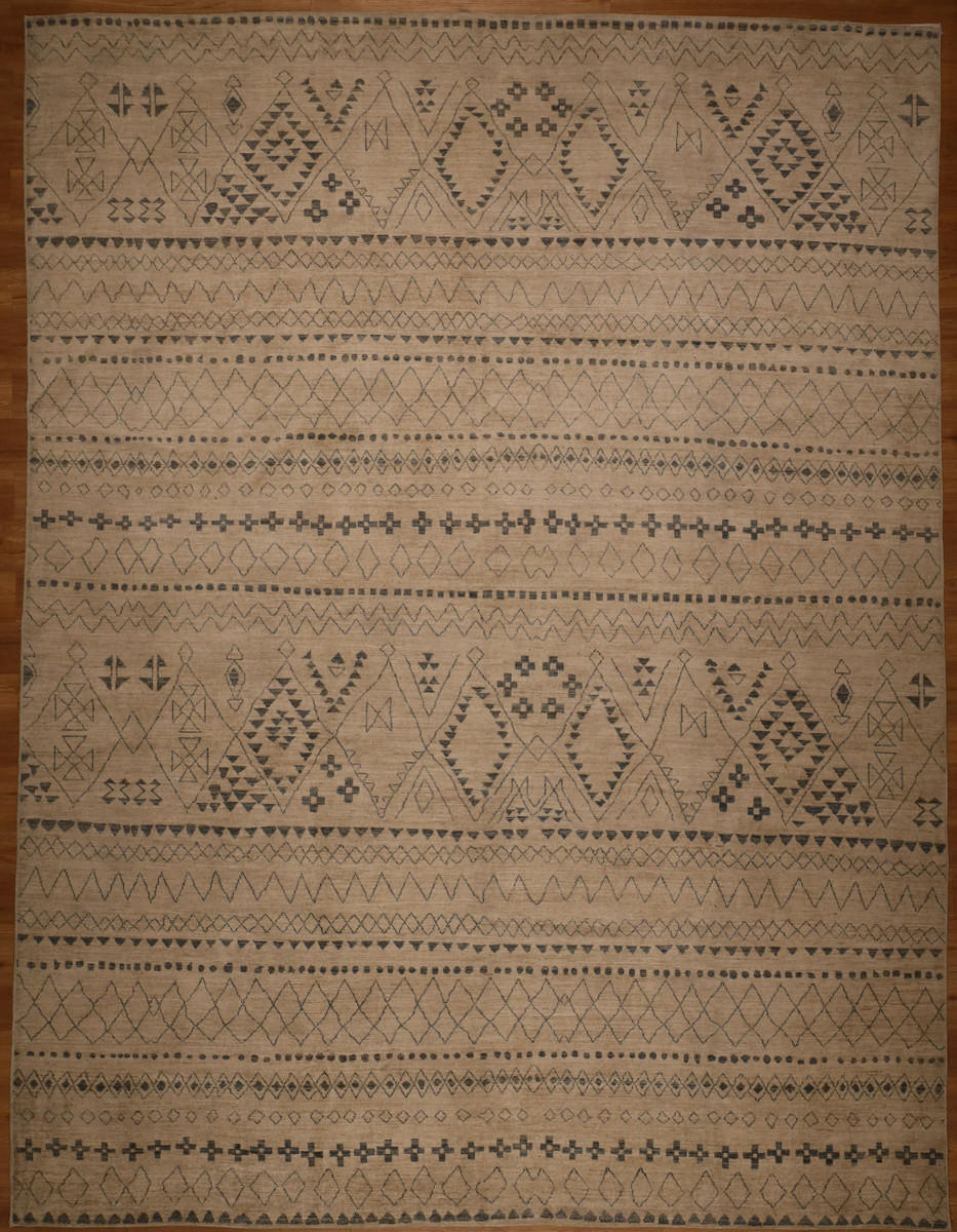 Contemporary design rug, hand woven with hand spun wool and vegetable dyes; it measures 8'11 X 11'10. This beige background modern design rug could last for decades. visit us today or purchase it on our secure website with fast check out and take advantage of our free shipping.