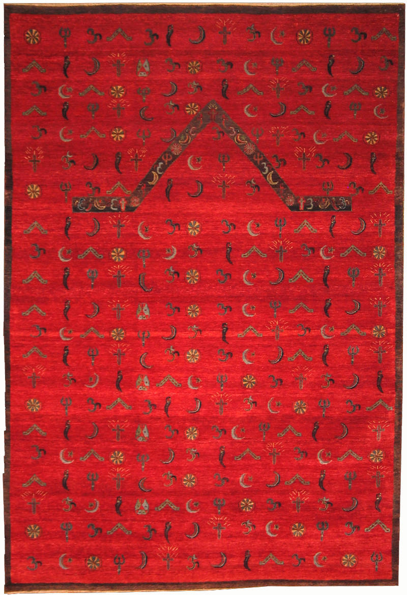 This rug is woven with hand spun wool and vegetable dyes in India with a prayer rug design. Visit us and take this rug for a free home trial, or purchase it on our secure website and take advantage of our free ground shipping.