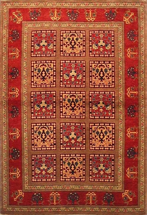 Sandy Brown background geometric design rug 4'2 X 6'1, Hand knotted with wool pile and cotton foundation.