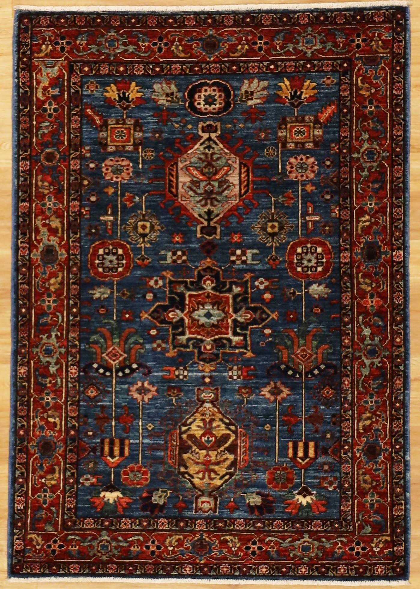 Small blue and red tribal design carpet 3'5"x4'10"