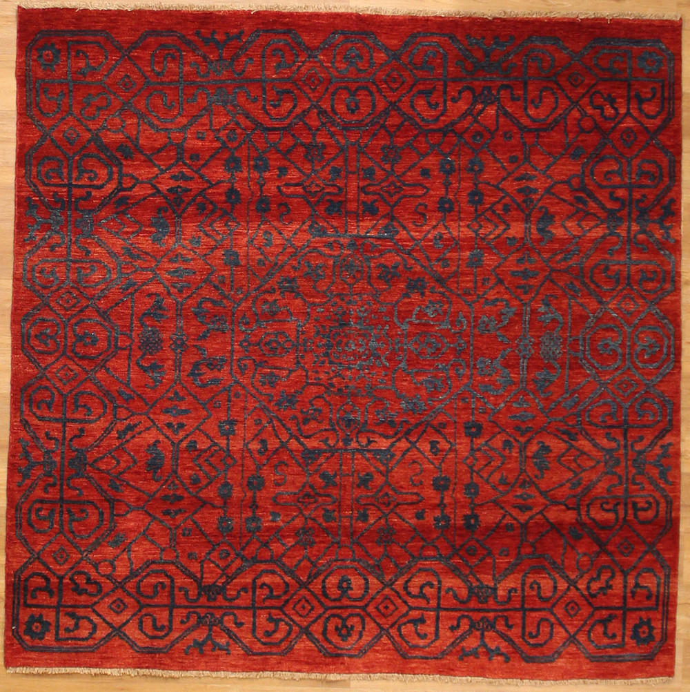 This rug is woven in India with vegetable dyes and hand spun wool. This contemporary design rug is produce by organize weaving project in India. Using hand carded, hand spun wool and vegetable dyes with and unusual design and color combination, makes this high quality rug easy to decorating with.