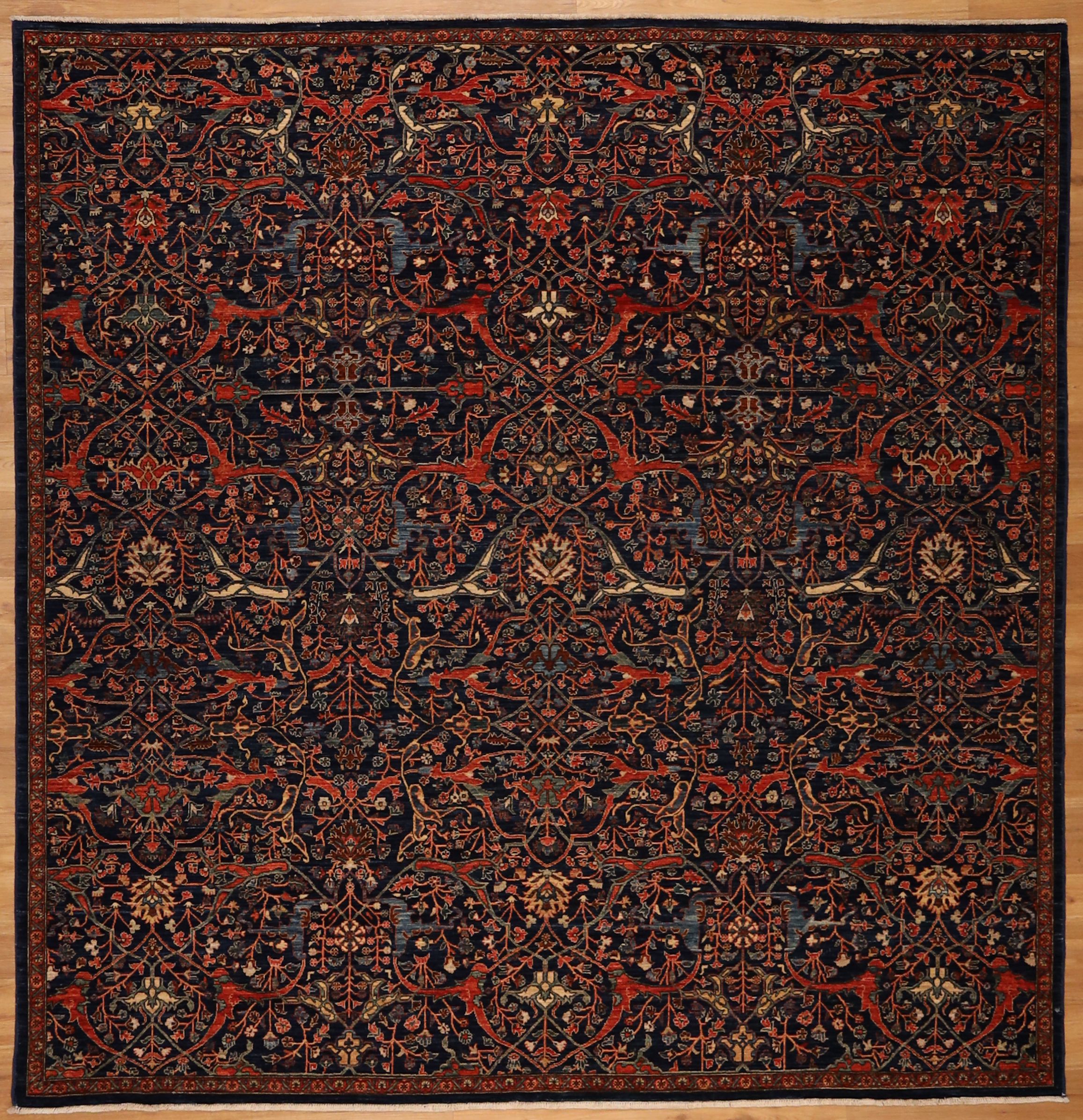 This hand-knotted square-sized carpet is woven in a traditional design, with hand-spun wool and vegetable dyes. The background color is navy blue. Other colors in this rug are red, brown, beige, and light blue. The size is 8’ x 8'2". The high quality of this rug makes it suitable for high-traffic areas and can last for decades. Visit us today to see this rug in person, take it home for a free home trial, or buy it on our secure website and take advantage of our free shipping and easy return policy.