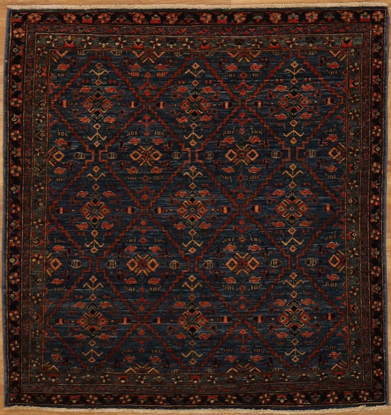 This hand-knotted carpet is woven in a tribal design, with hand-spun wool and vegetable dyes. The background color is medium blue. Other colors in this rug are salmon, brown, and beige. The size is 4’5” x 4'8". The high quality of this rug makes it suitable for high-traffic areas and can last for decades. Visit us today to see this rug in person, take it home for a free home trial, or buy it on our secure website and take advantage of our free shipping and easy return policy.