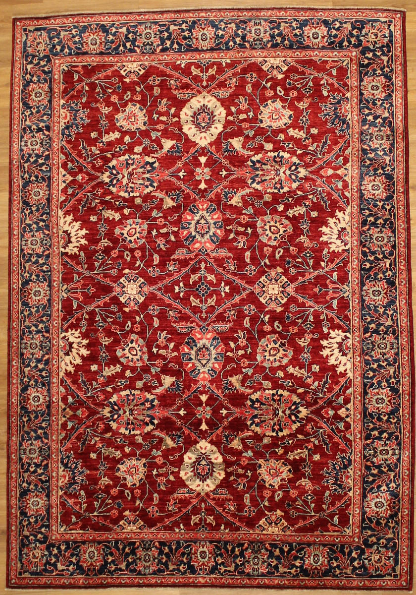 Hand knotted traditional 6'x8'9 red color rug woven in Pakistan with hand spun wool. This carpet will liven up any living room bedroom or front entry and with high quality wool, it would last for decades.