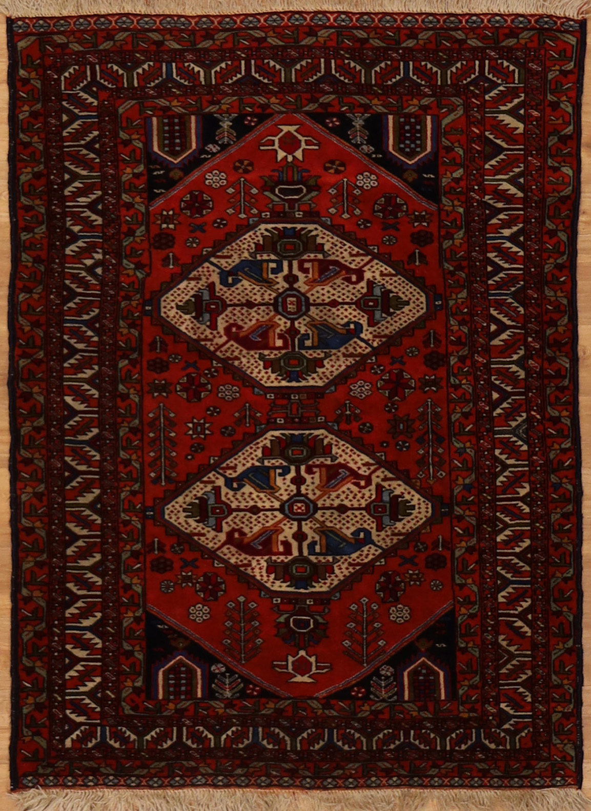 This Vintage hand-knotted rug is a Persian Shiraz circa 1970s. It is in good condition. The background color of this 3'10" x 5'5" rug is Red. Visit us today to see this antique rug in person or buy it on our website and take advantage of our free shipping and easy return policy.